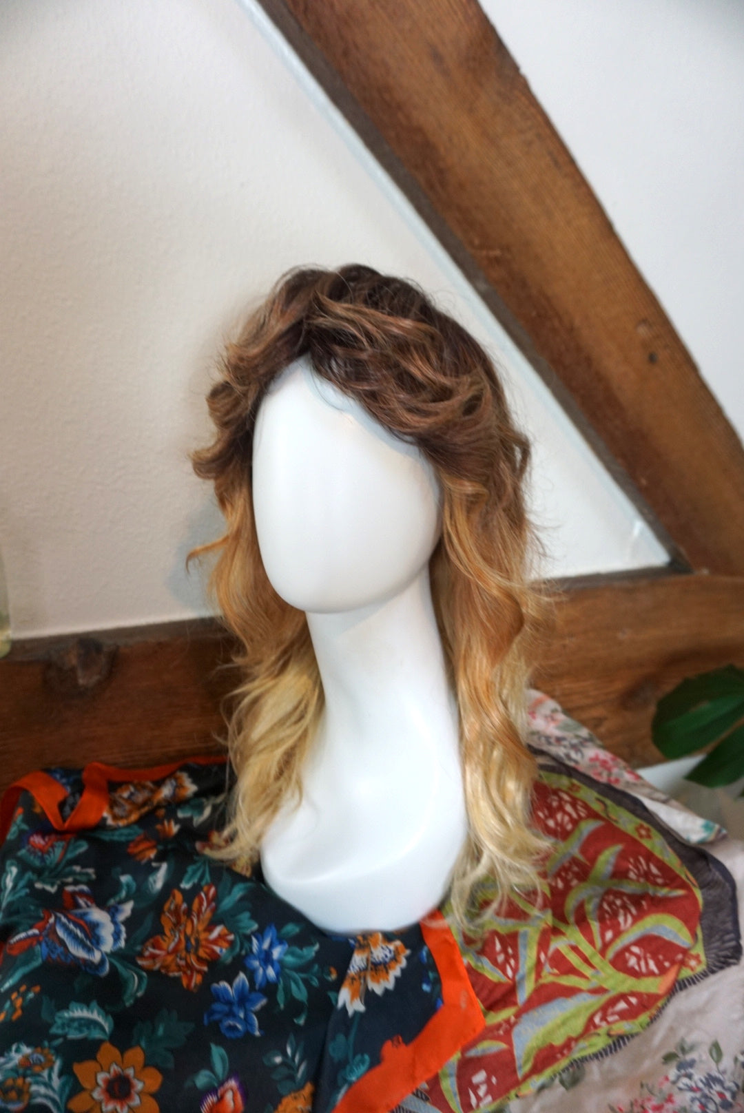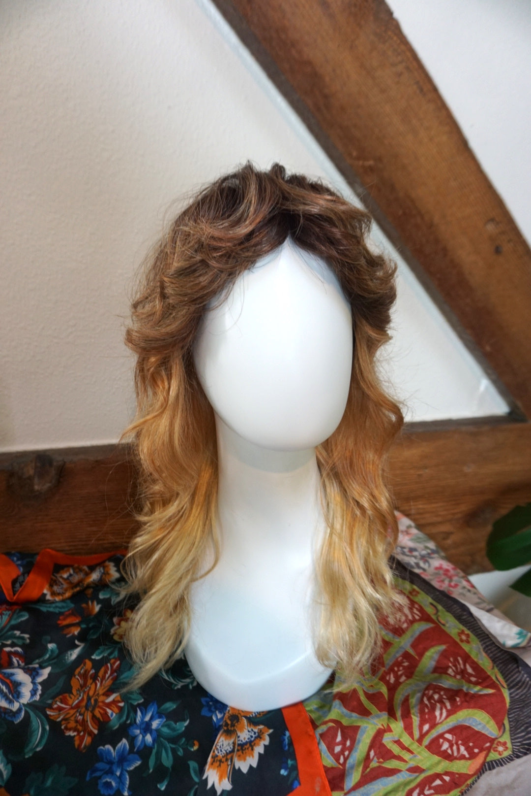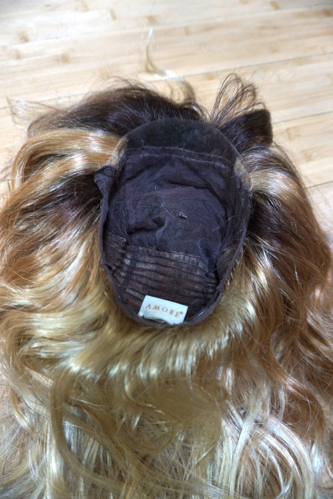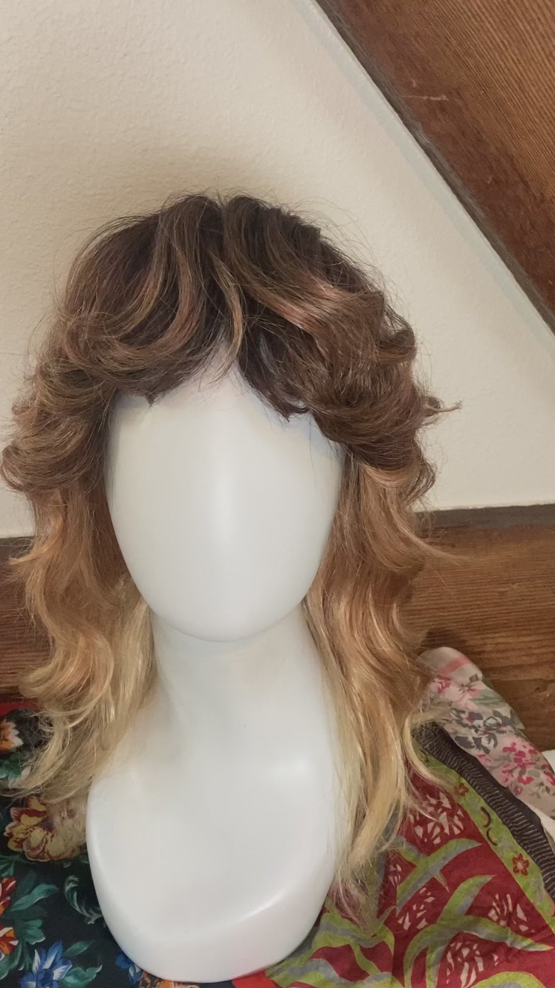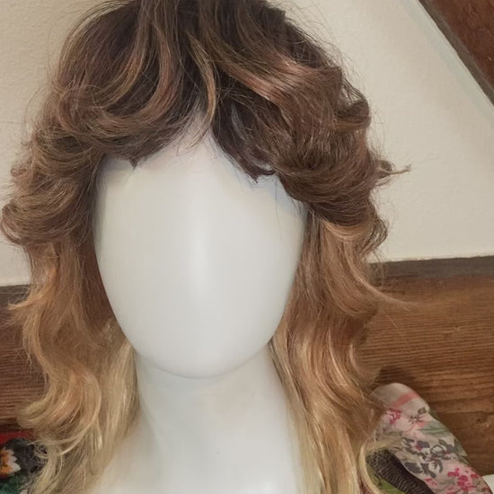 A wispy texture wonderland of a hairstyle! This lace front soft cap wig from Amore by Rene of Paris is super comfortable to wear and dawns a beautiful color called "Melted Sunset". Cut into a classic shag it has lots of natural volume and a playful, flirty bang. Hair is synthetic but can withstand heat up to 285 degrees. The bang is 2.5" long in the center, and the length in back is 12". I've shared a photo of the soft cap inside and have a video of the hand tied detail upon request. A one of a kind addition to your wig collection!