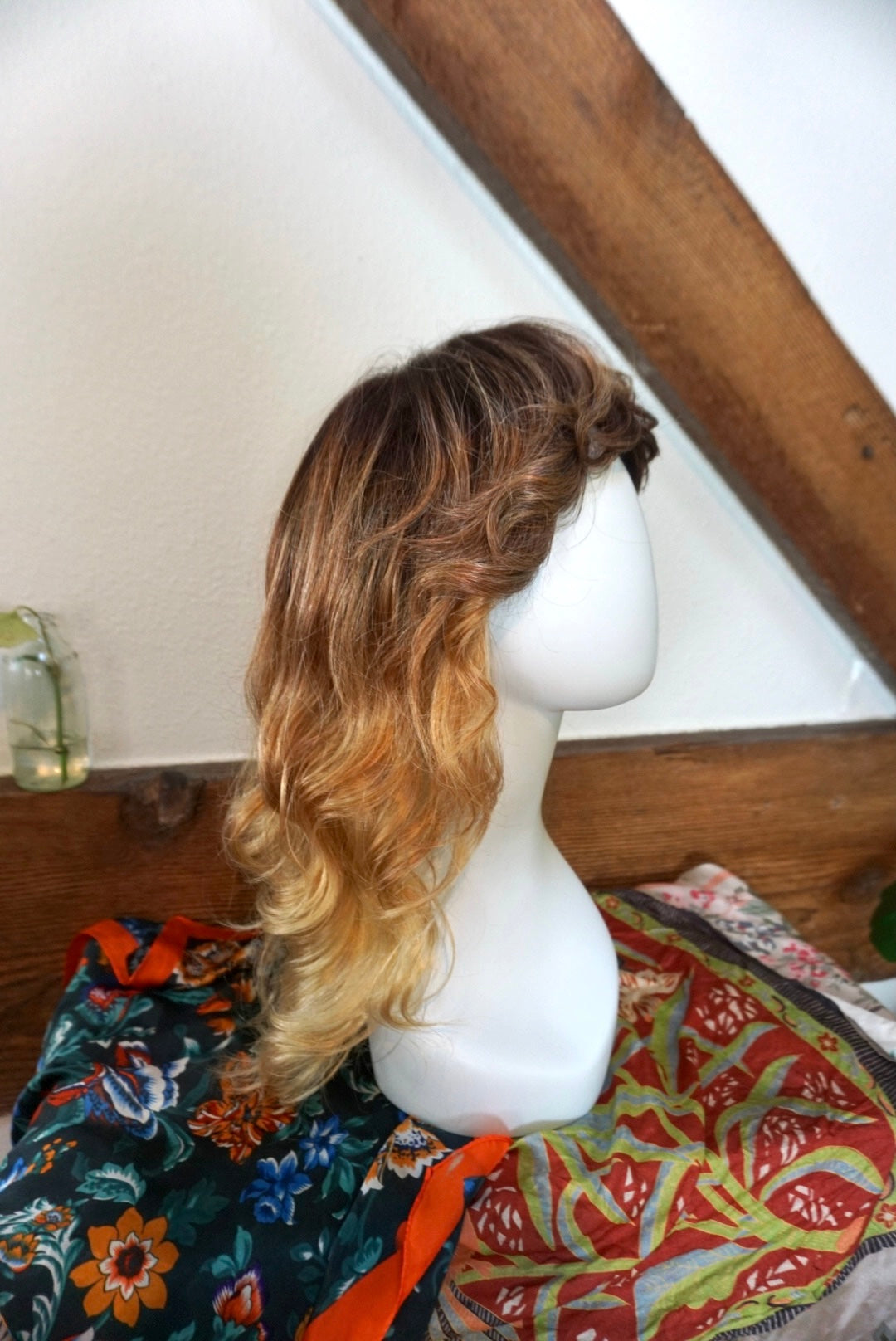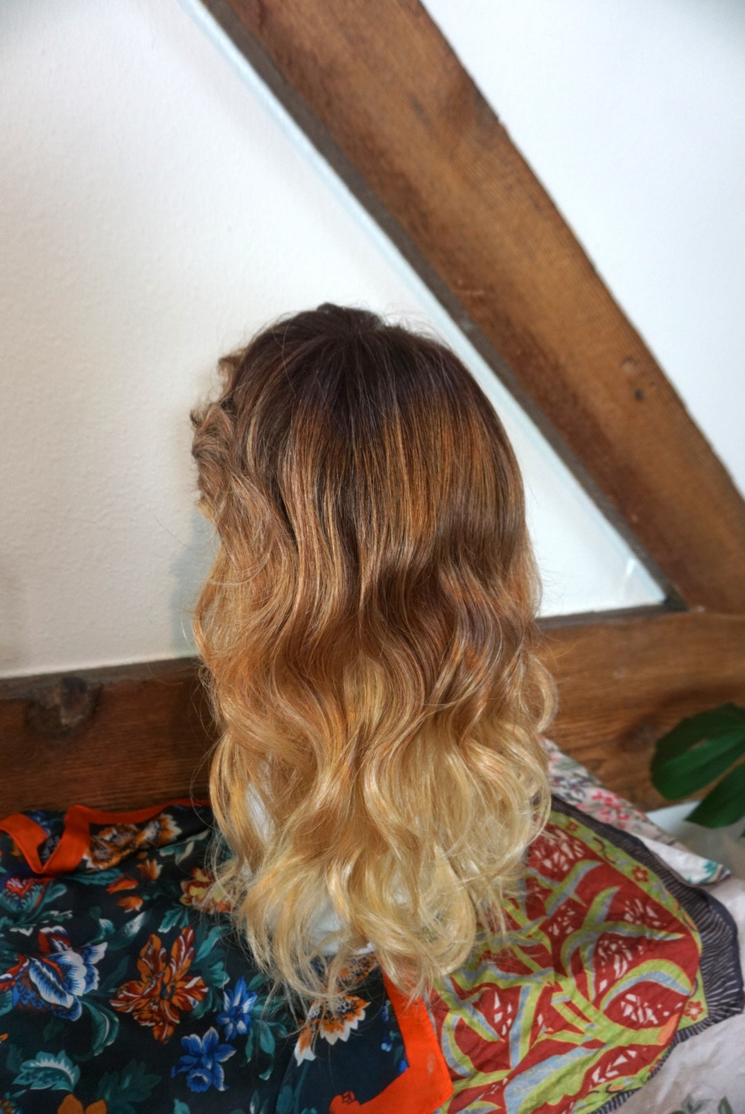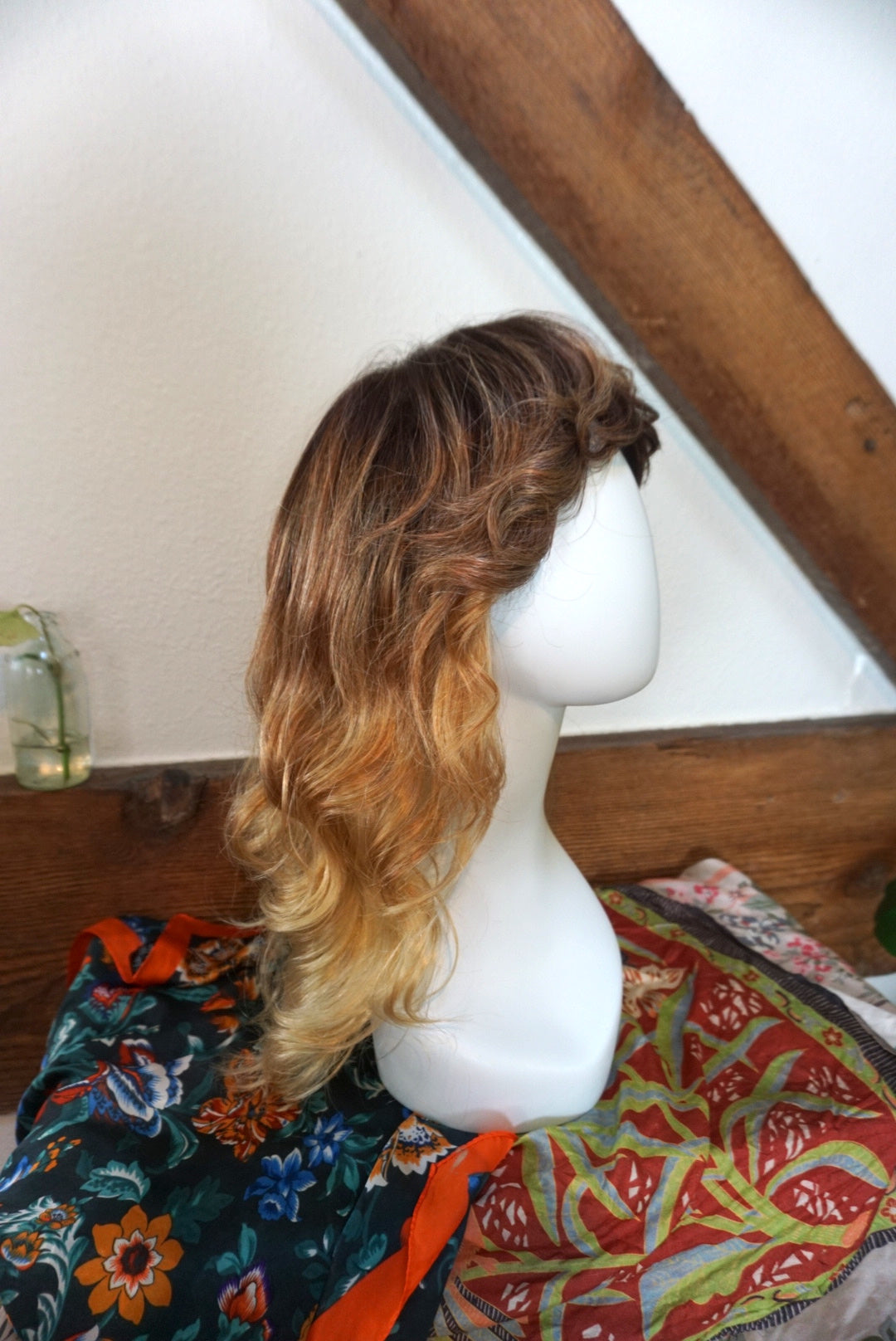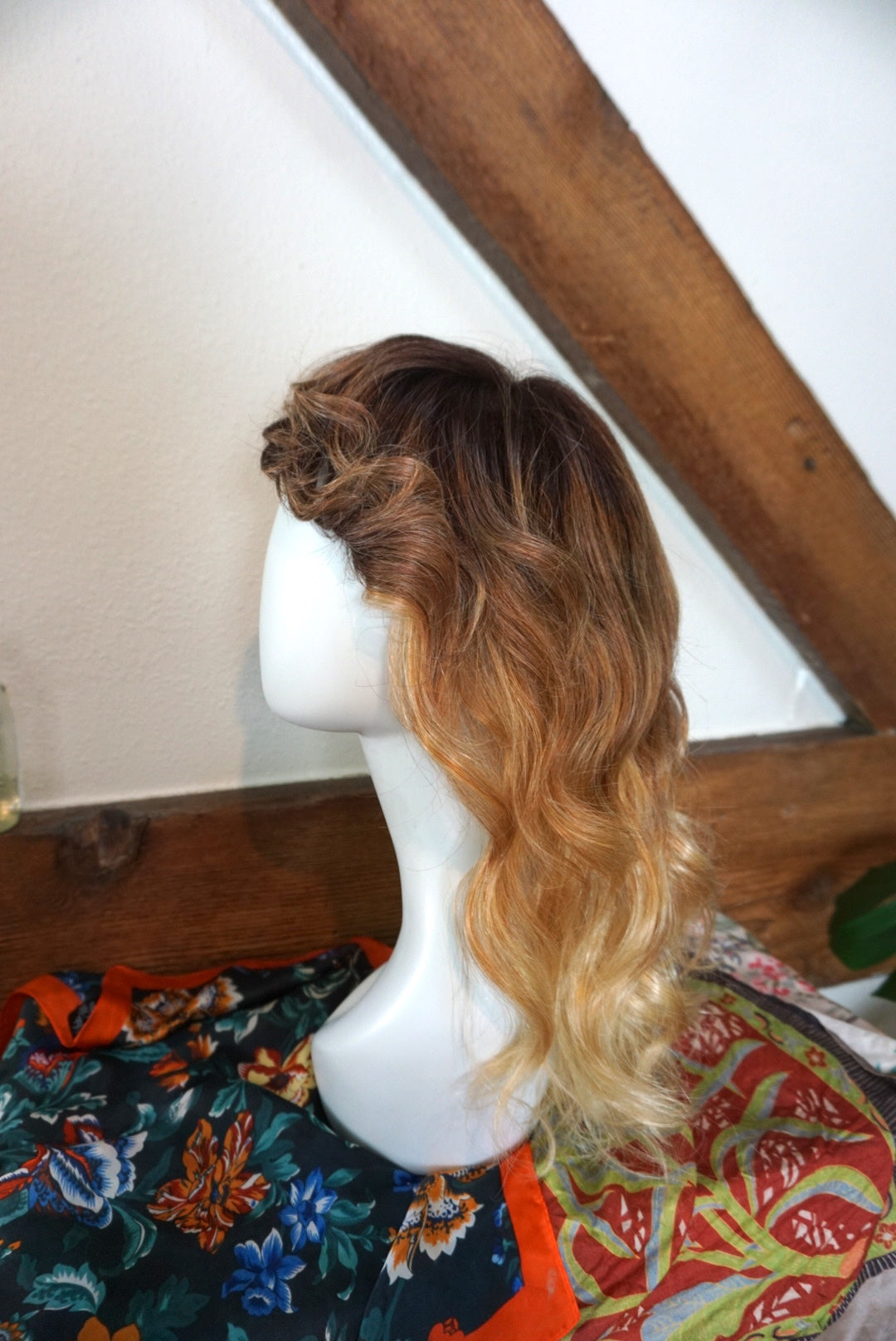 A wispy texture wonderland of a hairstyle! This lace front soft cap wig from Amore by Rene of Paris is super comfortable to wear and dawns a beautiful color called "Melted Sunset". Cut into a classic shag it has lots of natural volume and a playful, flirty bang. Hair is synthetic but can withstand heat up to 285 degrees. The bang is 2.5" long in the center, and the length in back is 12". I've shared a photo of the soft cap inside and have a video of the hand tied detail upon request. A one of a kind addition to your wig collection!