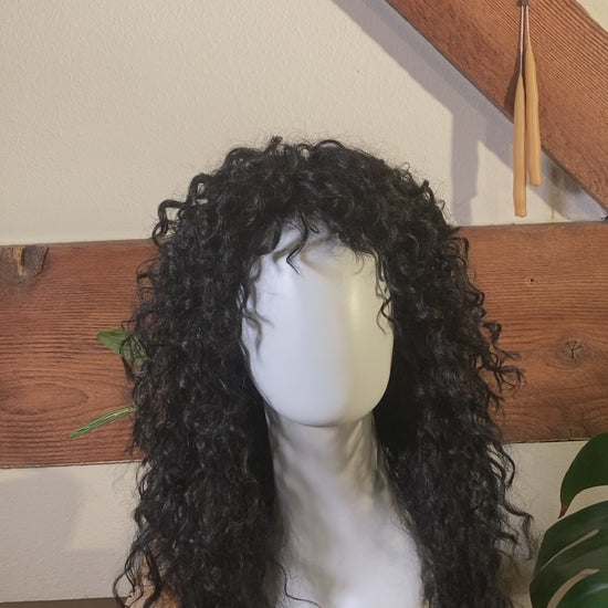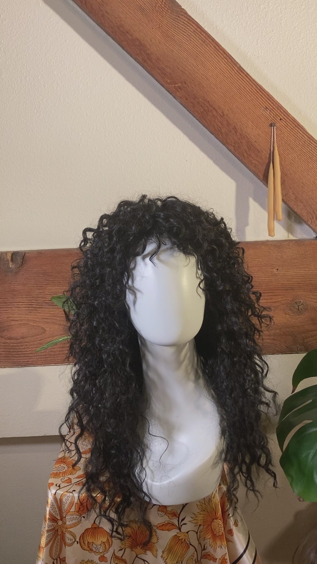 Shags are in! The cut is so fun and flattering, giving a rockstar, edgy vibe! Lots of layers and volume. This wig is a color 1B (off black), synthetic, lace front+middle part with a satin liner. Lace is pre-cut. Length is 17", bangs sit at 2.5"-3" on the forehead. I'd be willing to customize the length of the bang if you need it!